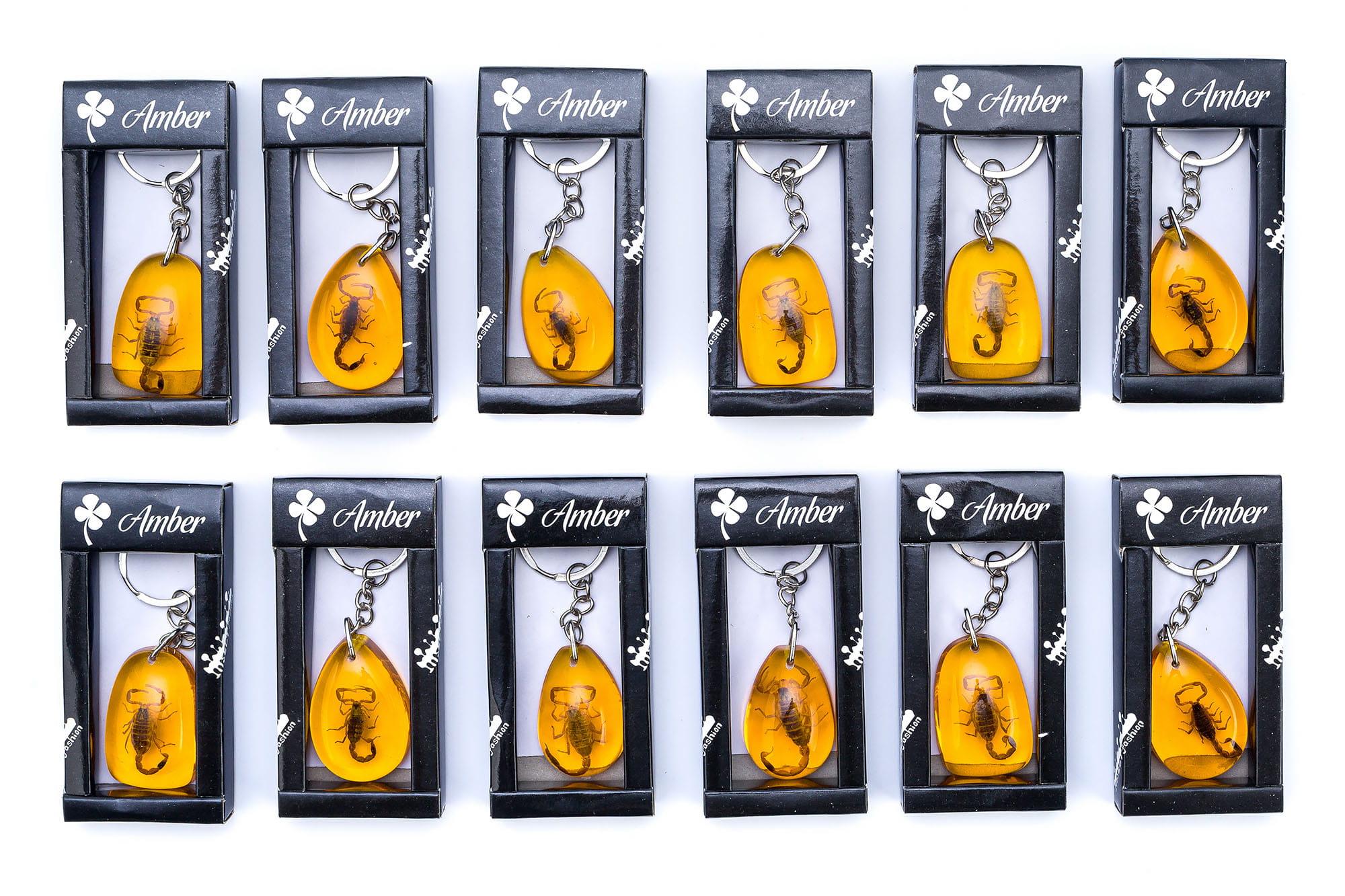 BRELOCZKI ze skorpionami zatapiane w masie bursztynowej . Pakowane po 12 sztuk.
